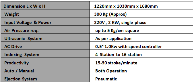 Variable speed, * Auto ejection ,* Choice of Station4, 8 or 16 Stroke length 75mm or can be customize (25mm~100mm) Ultrasonic system as per requirement.