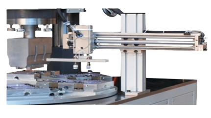 The machine employs ultrasonic technology to create a strong bond between thermoplastic parts. It typically consists of a rotary table that moves parts into the welding station, where ultrasonic vibrations are applied to create the weld. The rotary table indexes parts, allowing for continuous and efficient production.
